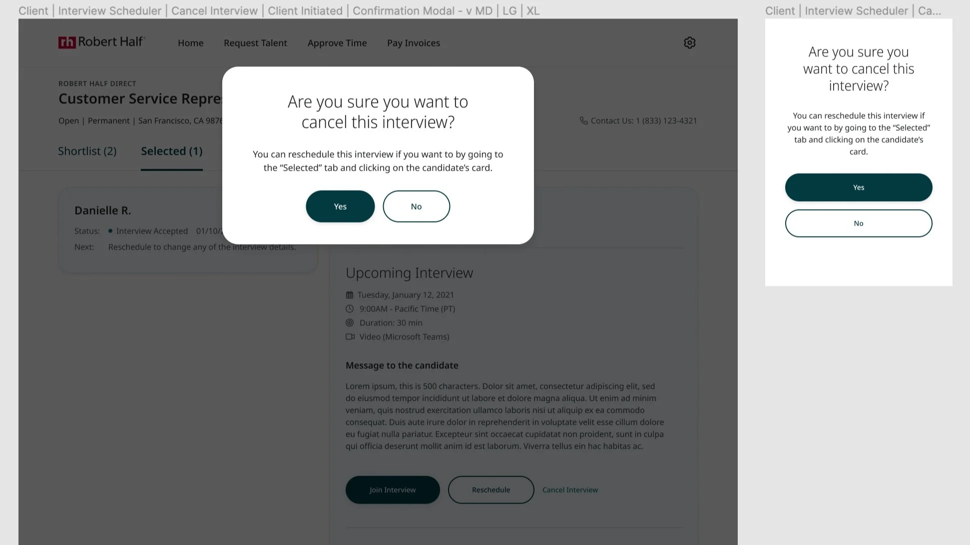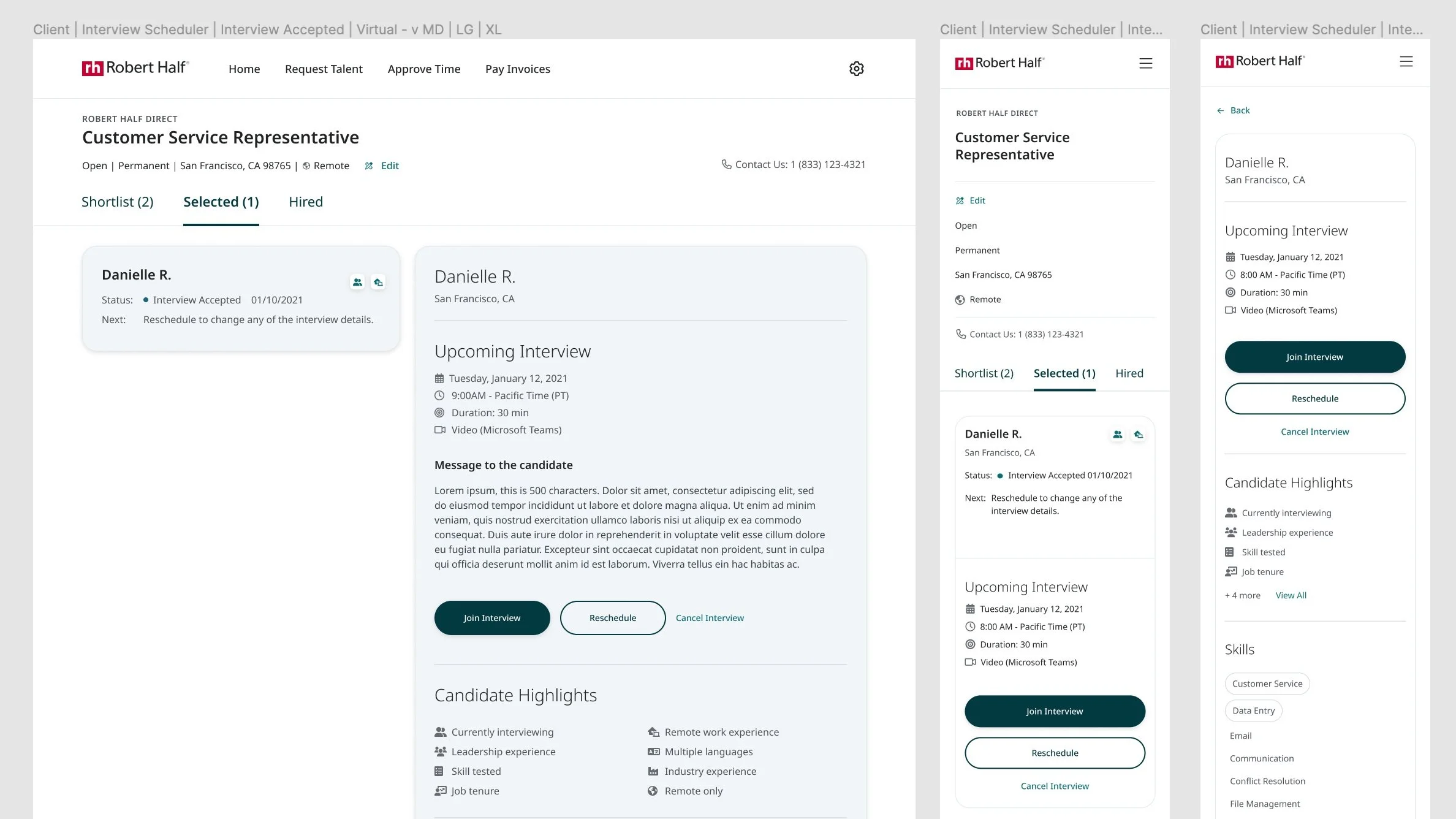 Overview: To enhance the Robert Half Self Service tool to help hiring managers (clients) and candidates connect we built a custom scheduling tool. I am the lead designer for the Client Web experience and focused on their experience when building the interview scheduler tool in collaboration with our product owner, dev team, and stakeholders.