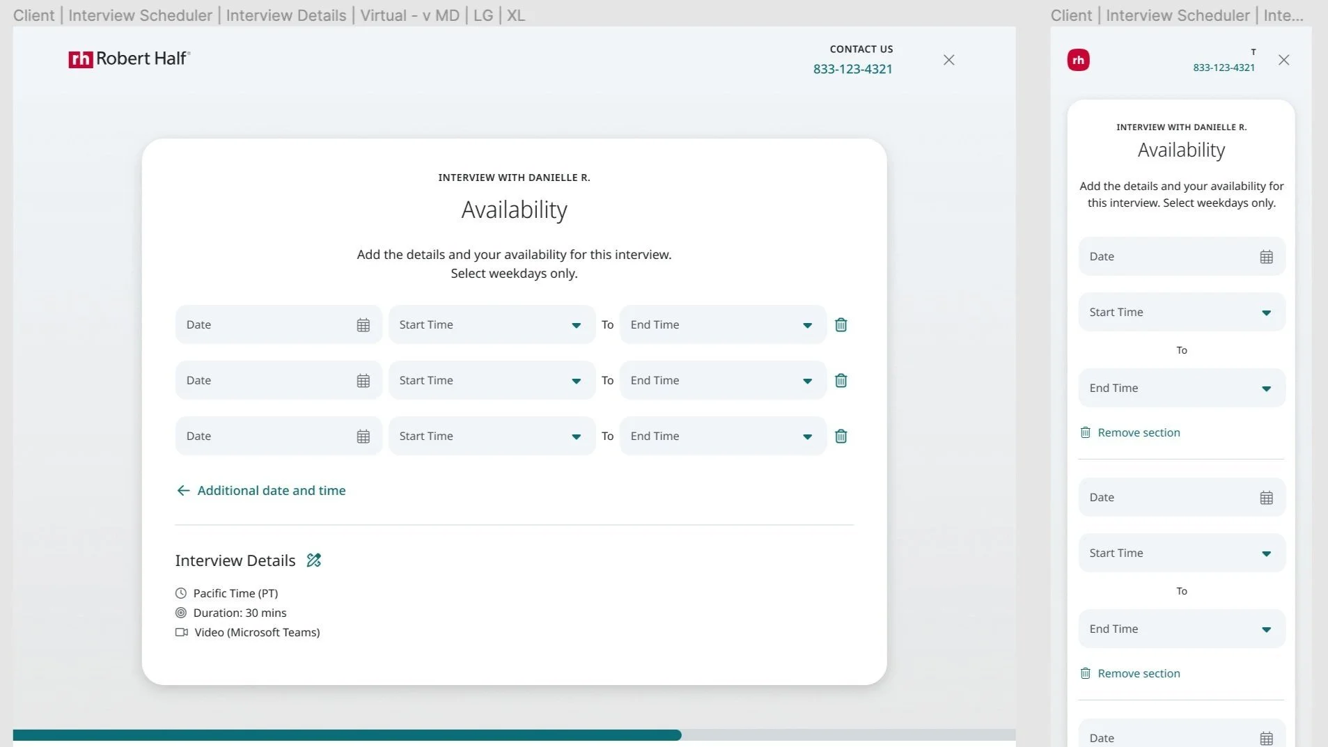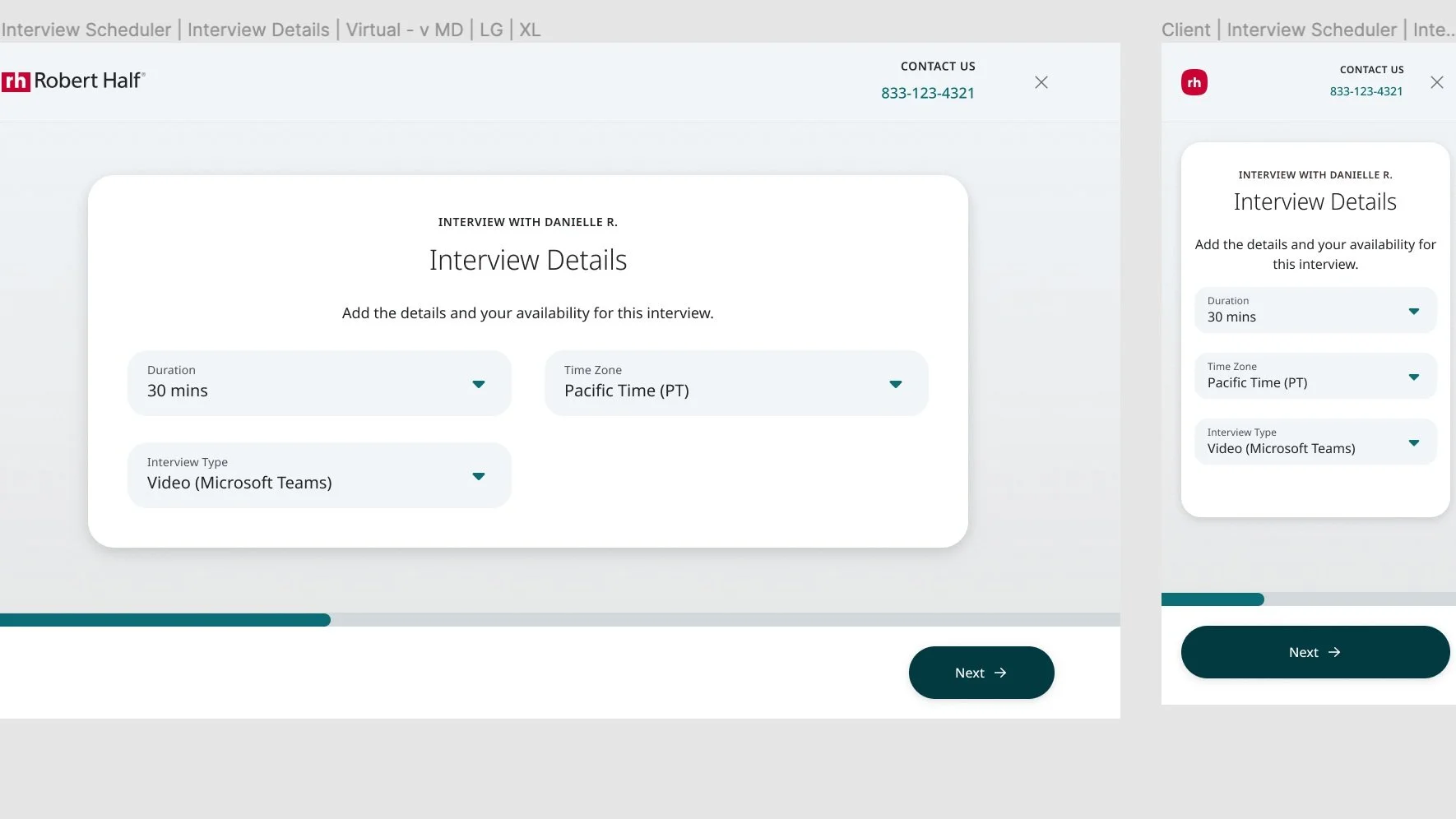 Robert Half is going through a large rebranding that will be launched in July 2023. With the rebrand, I redesigned all the client screens, including the interview scheduler ones. With the new design system from Argo (hired design team), the pages are easier to navigate with the new wizard design and more modern.